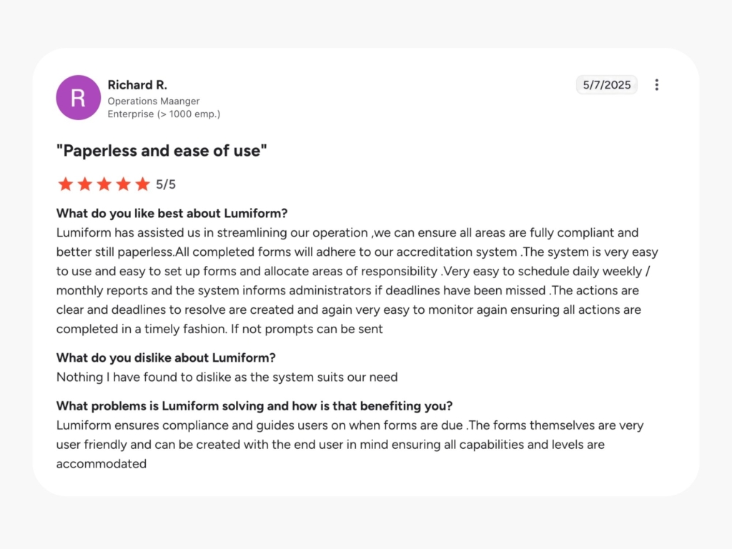 Teams that need built-in issue management, resolution tracking, and inspection-specific analytics without additional setup will find Lumiform’s specialized approach aligns well with quality and safety priorities.