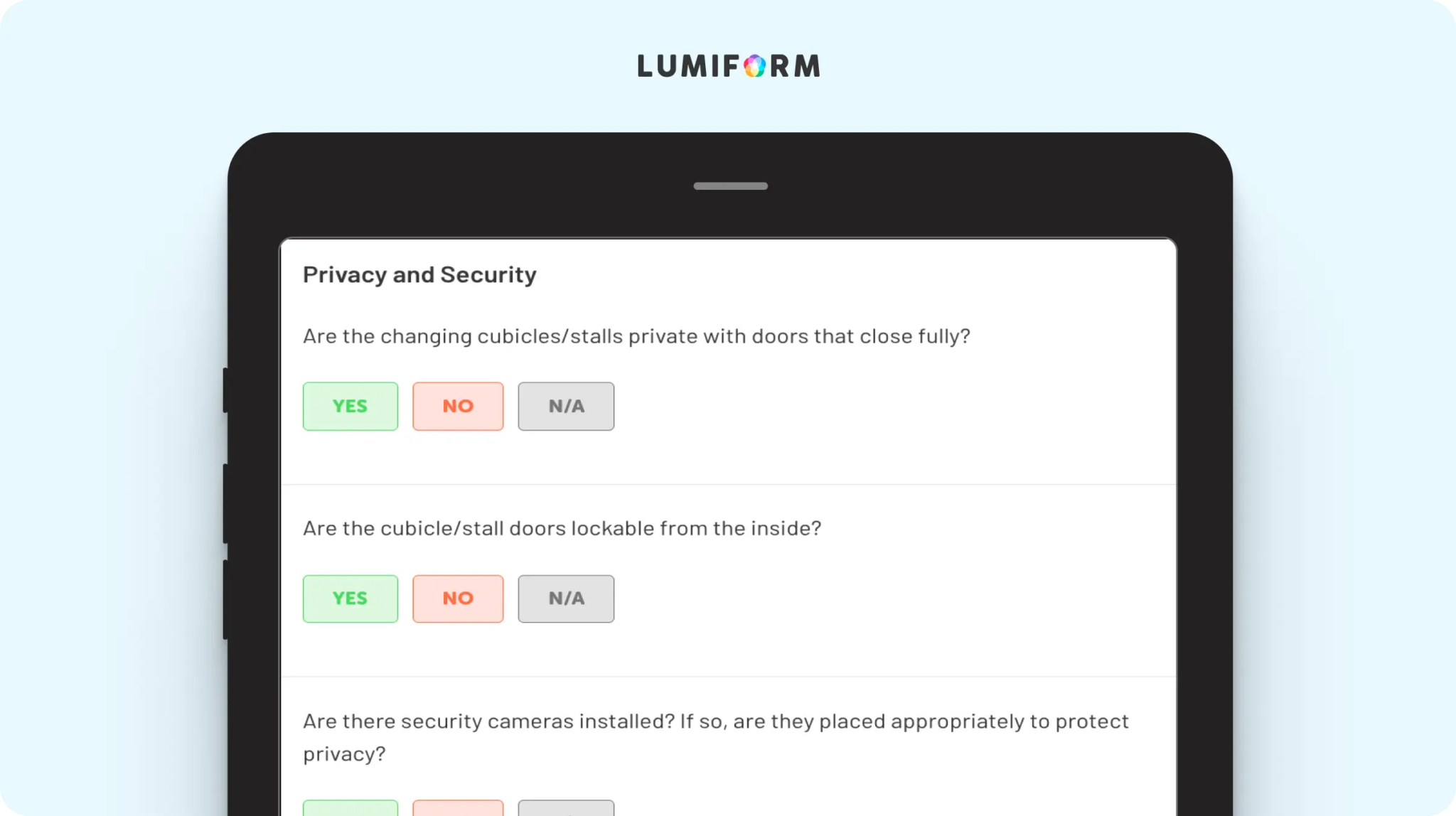 The focus of this template is on the particular needs of female changing areas, including enhanced privacy features and sanitary disposal maintenance. It covers mirror and vanity area cleanliness, adequate lighting verification, and proper functioning of all amenities. Customize this template by adding specific sections for hair dryer maintenance or makeup counter cleanliness depending on your facility type and clientele expectations. Contact our sales team to learn how Lumiform can help you implement this template across all your locations.Changing room cleaning checklist