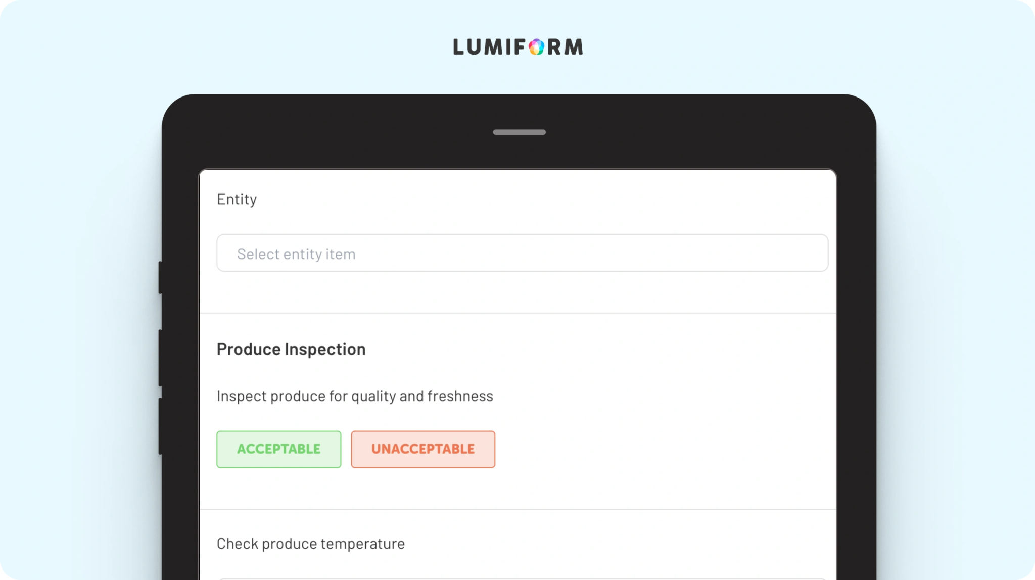 This template guides receiving staff through a systematic inspection of food deliveries, focusing on temperature verification, packaging integrity, and expiration dates. It includes sections for supplier information, delivery conditions, and product-specific quality indicators to ensure food safety compliance. You can customize the acceptance criteria based on your specific menu items and storage capabilities, adding specialized checks for high-risk ingredients. Sign up for Lumiform to access this template and strengthen your food safety program.Produce receiving checklist